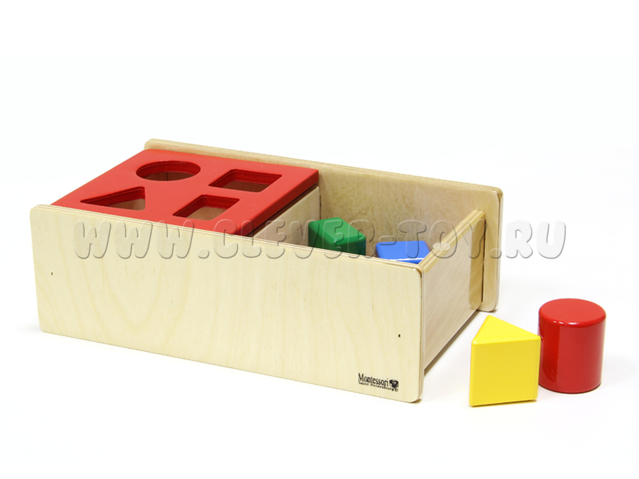 В этот уникальный сортер входят 4 основные фигуры: красный цилиндр, синий кубик, зелёная прямоугольная призма, желтая треугольная призма. Фигуры крупного размера и очень удобны для захвата маленькой ручкой. Присутствует очень удобная перекидная крышка, которая способствует развитию нового движения малыша.