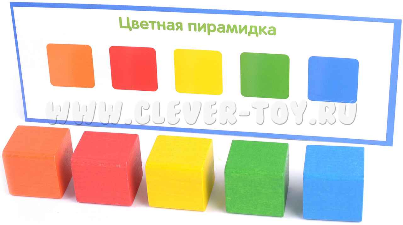 • 20 деревянных кубиков (3х3х3см) 4-х цветов: жёлтый, оранжевый, красный, зелёный, голубой;