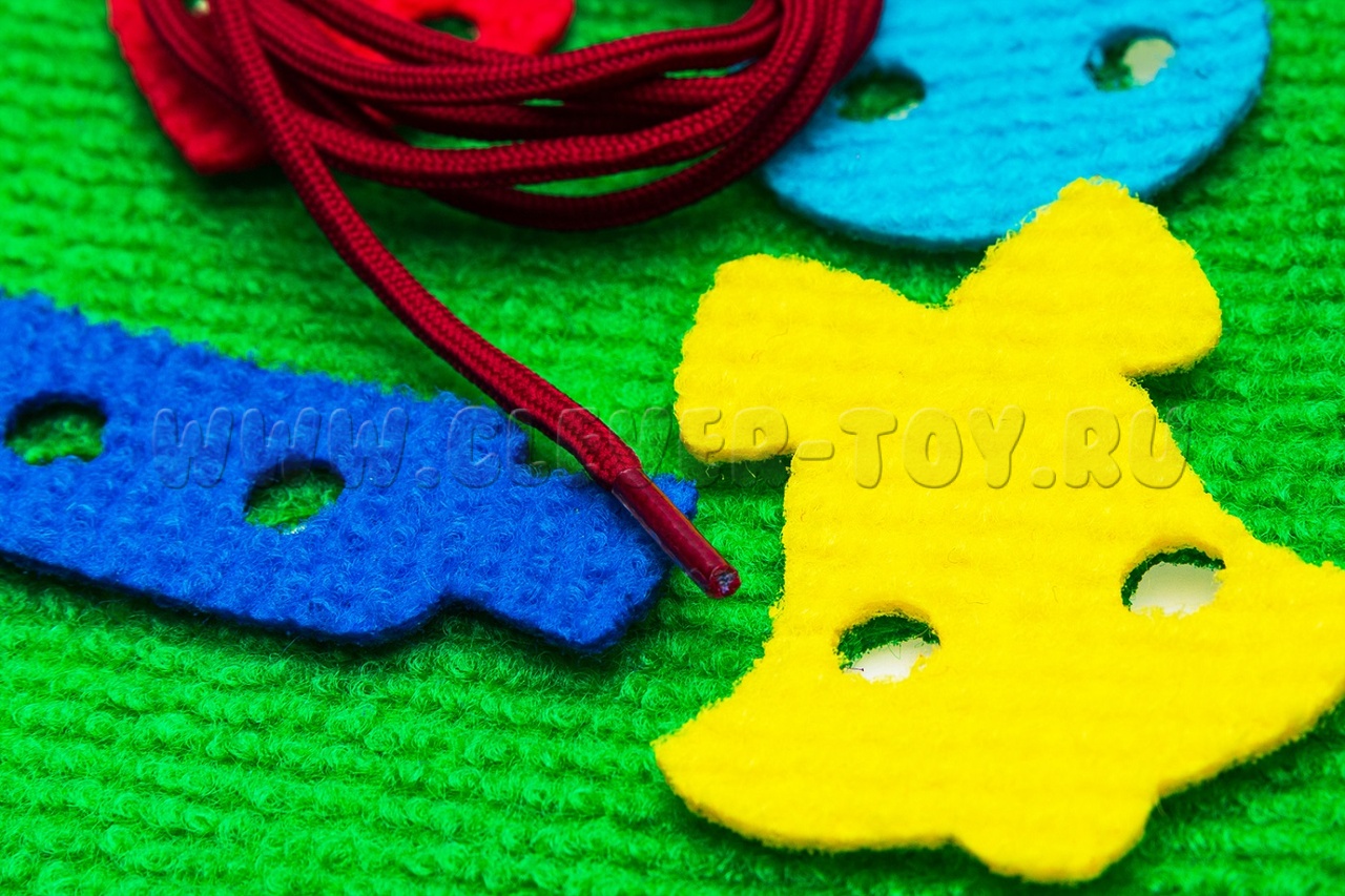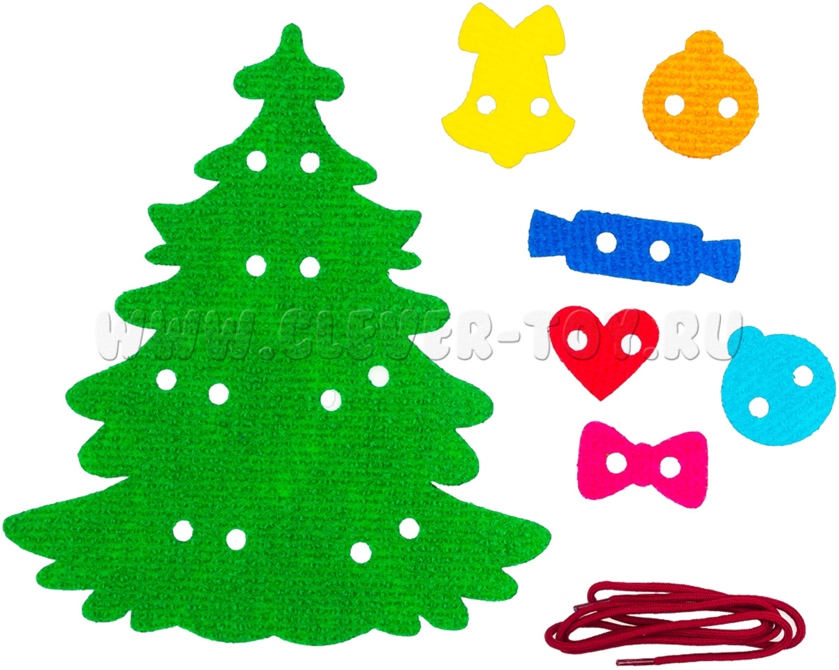 Завязывание шнурков – непростая задача для ребенка. В этом ему поможет елка – конструктор на шнуровке. Регулярные занятия с данным учебным пособием сформируют у малыша терпение, усидчивость и аккуратность, а также дадут представление о формах и цветах.