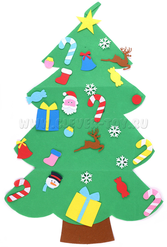 Елка изготовлена из фетра и ковролина. Сочетание этих материалов делает игрушку плотной, долговечной, но при этом приятной на ощупь и безопасной для детей.