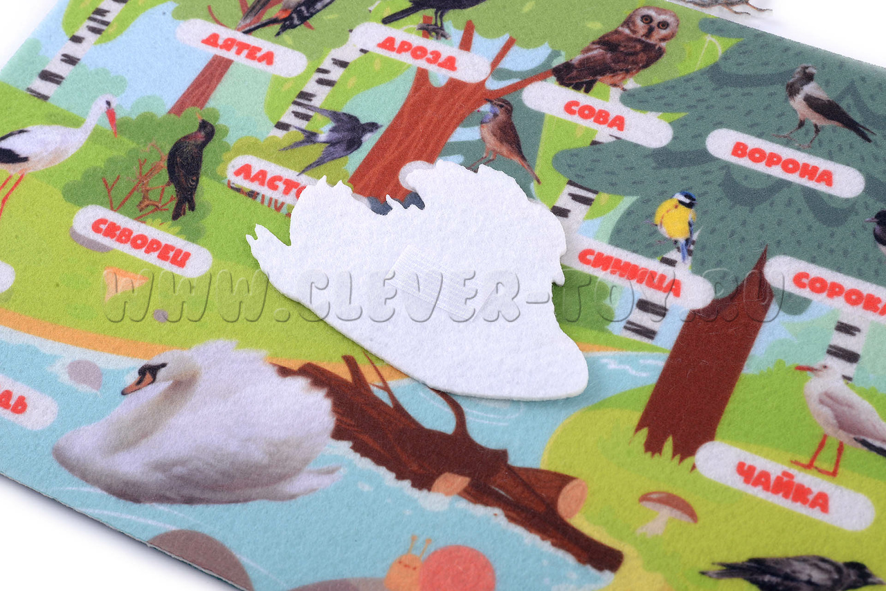 - Набор из 16 фигурок птиц на липучках (снегирь, дятел, дрозд, сова, ворона, воробей, ласточка, соловей, синица, сорока, скворец, голубь, чайка, аист, лебедь, грач)