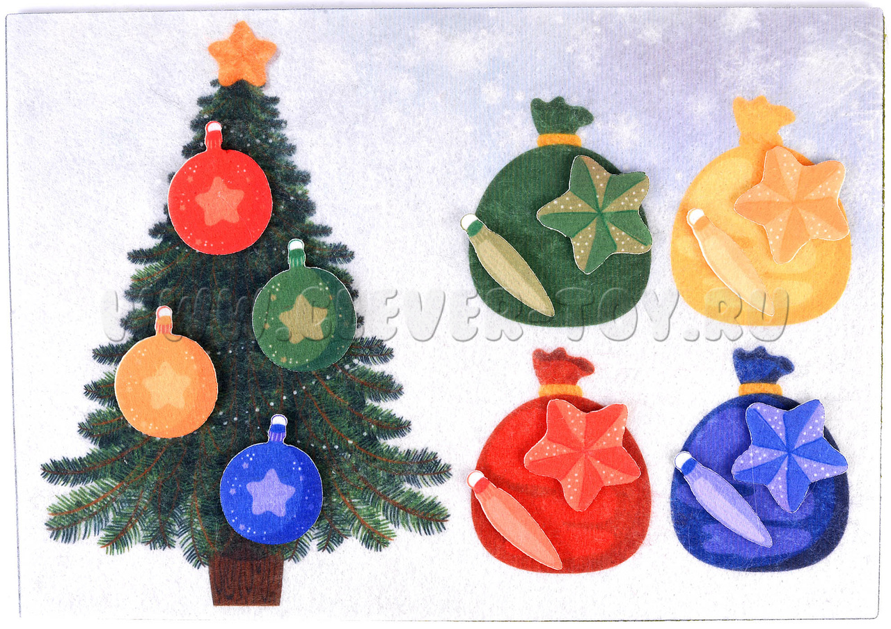 У каждой фигурки сзади есть липучка, при помощи которой можно размещать их на игровом поле. Ребенок может поместить игрушку на елку или распределить в мешочек по цвету.