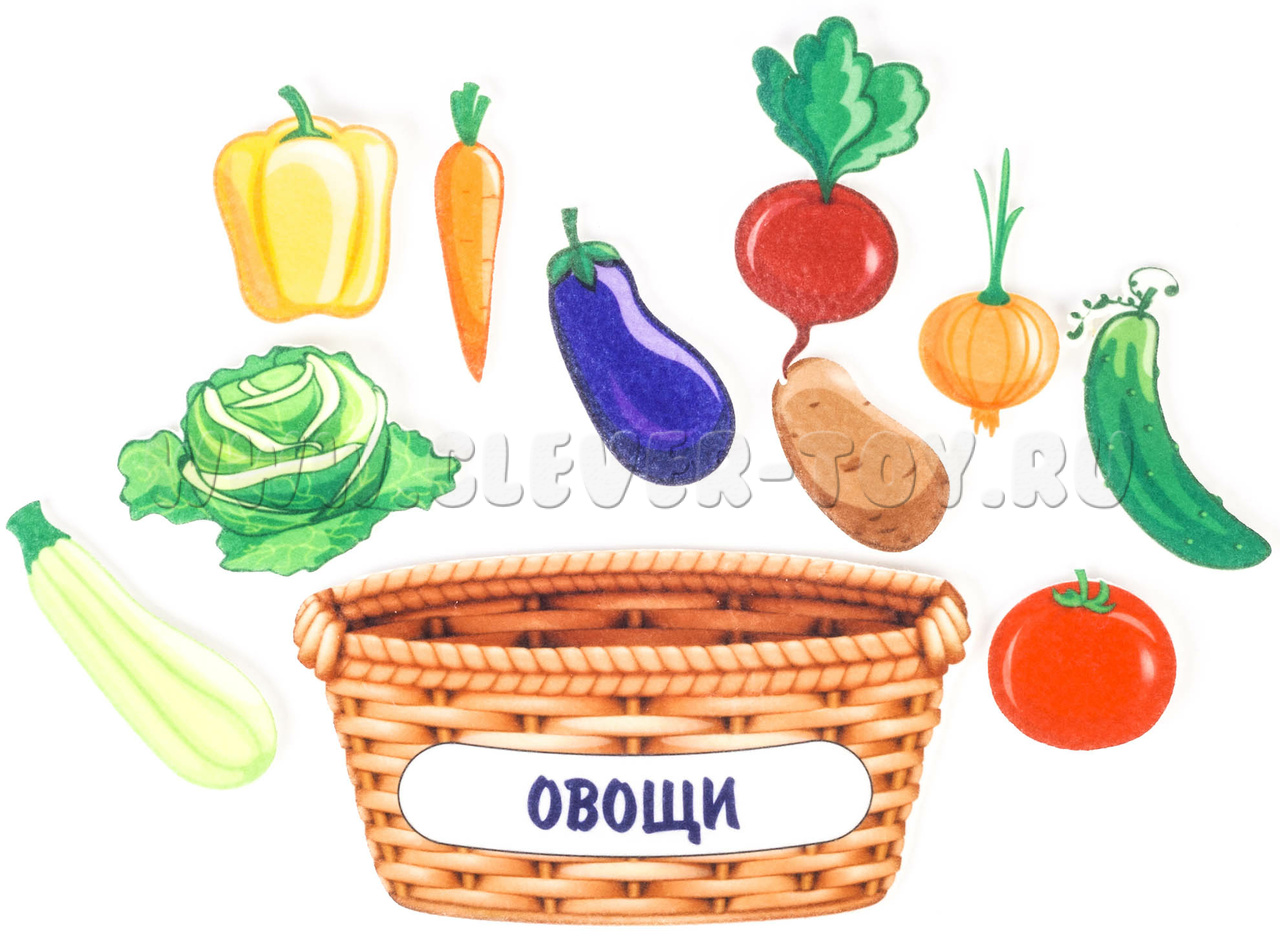 - овощи разных видов – 10 видов, морковка, помидор, лук, свекла, картошка, желтый перец, огурец, кабачок, капуста, баклажан.