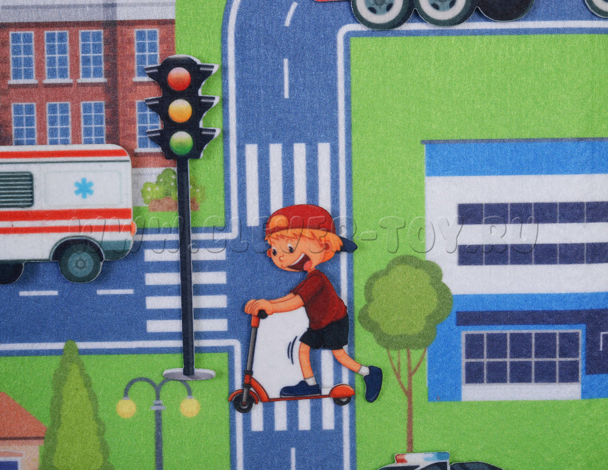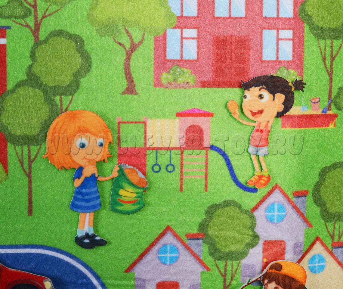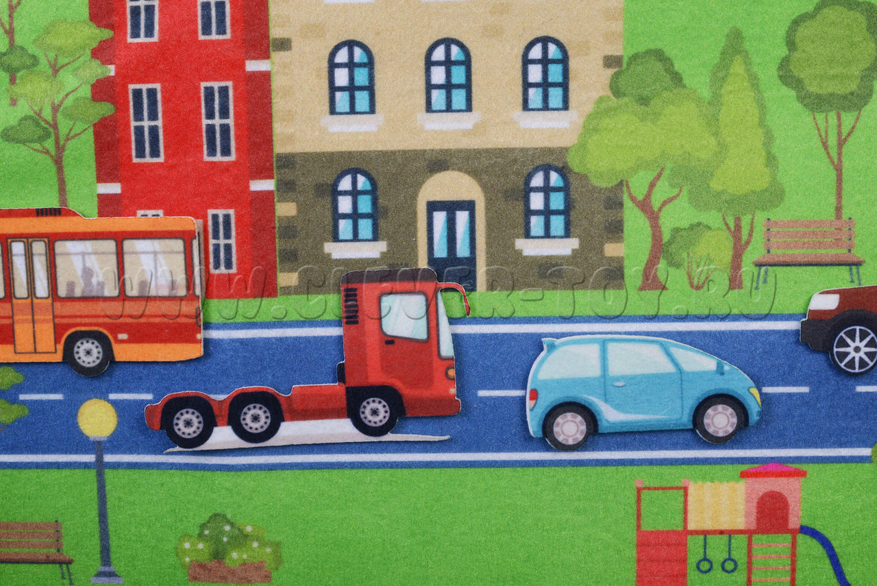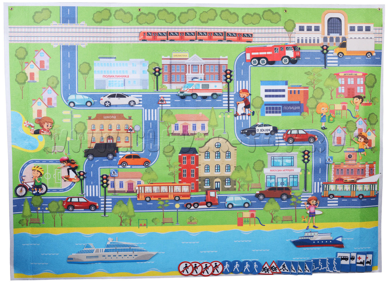 • игровое поле большого размера, выполненное в виде коврика с нарисованным на нём городом с дорогами, мостами, деревьями, зданиями;