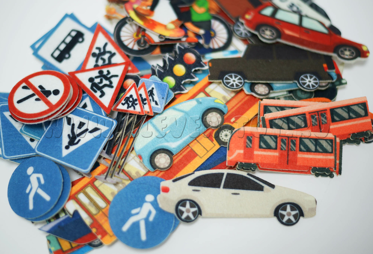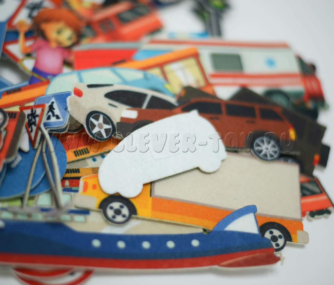 • 13 фигурок машинок и общественного транспорта: легковые и грузовые автомобили, поезд, троллейбус, полицейская машина, пожарная машина, скорая помощь, автобус; пароход и катер; более 20-ти дорожных знаков; 6 светофоров, 8 фигурок детей;