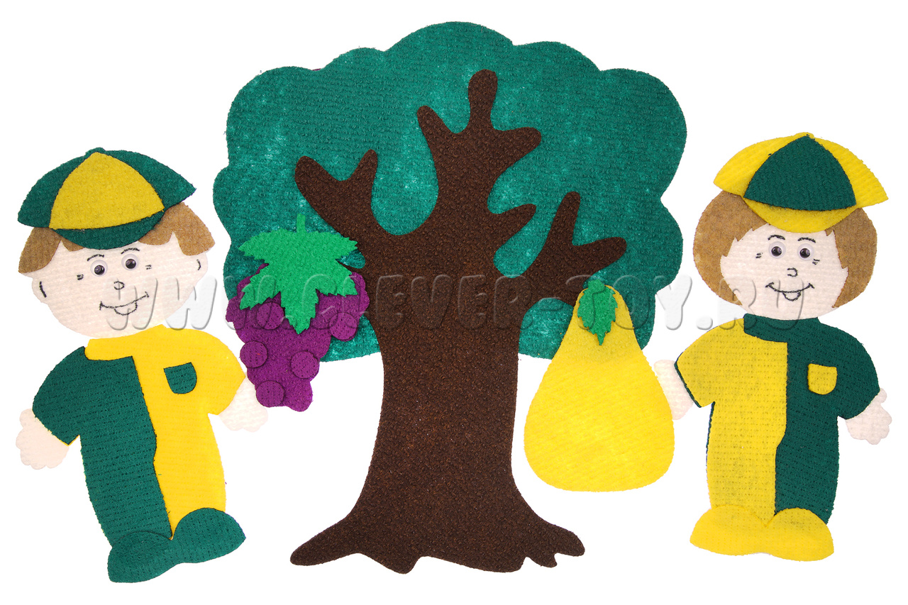 - герои – мальчик и девочка (каждый по 25*15 см); предметы – трактор (20*15 см), дерево (30*30 см), корзина (26*26 см);