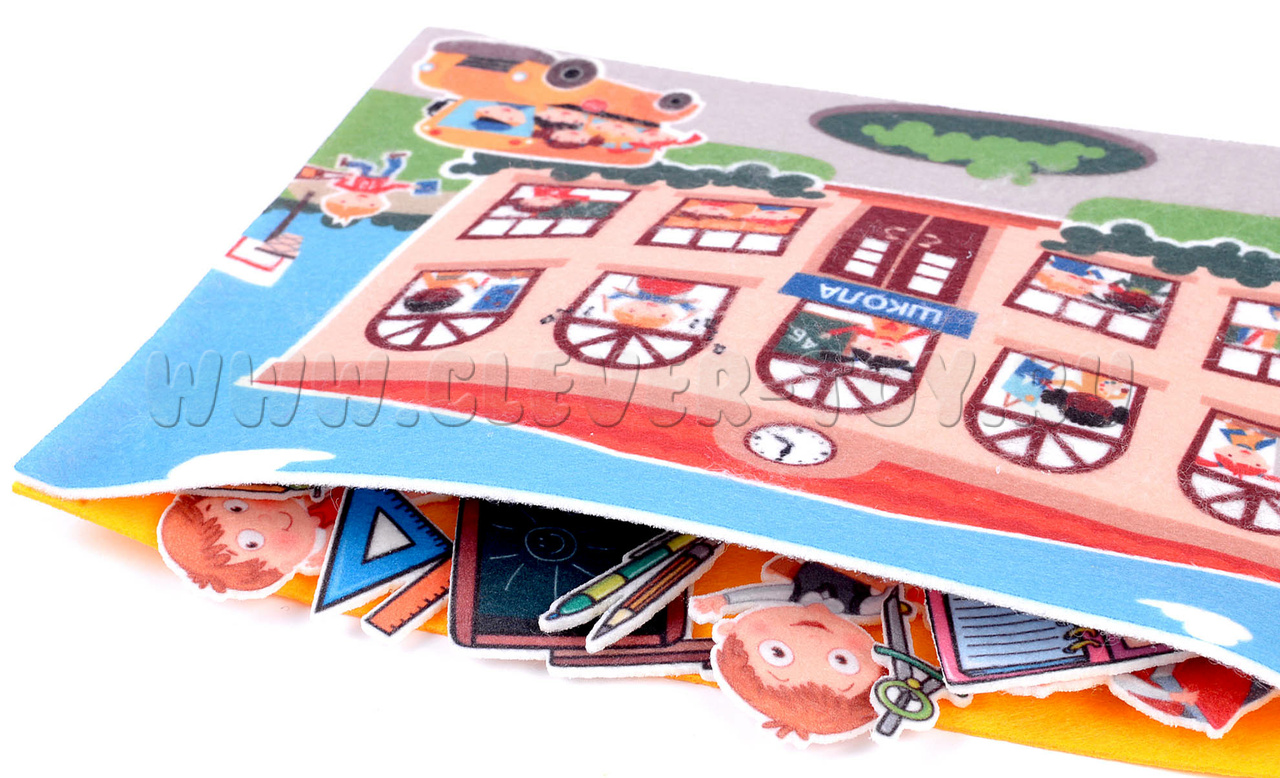 • придумывать сюжетно-ролевые игры на тему «Школа» с помощью фигурок на многоразовых липучках.