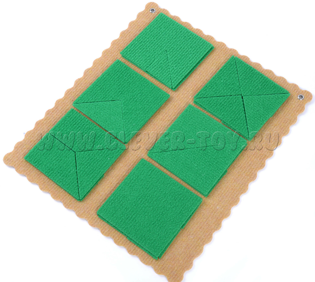 - 36 элементов из ковролина (многоугольник 1 – 1 шт., многоугольник 2 – 1 шт., многоугольник 3 – 1 шт., многоугольник 4 – 1 шт., треугольник маленький – 10 шт., треугольник средний – 7 шт., треугольник большой – 2 шт., квадрат большой – 1 шт., прямоугольник – 2 шт., трапеция 1 - 3 шт., трапеция 2 – 1 шт., квадрат маленький – 6 шт.;