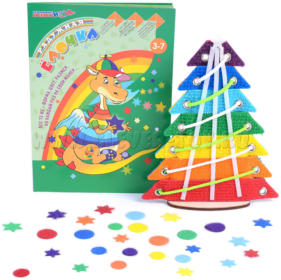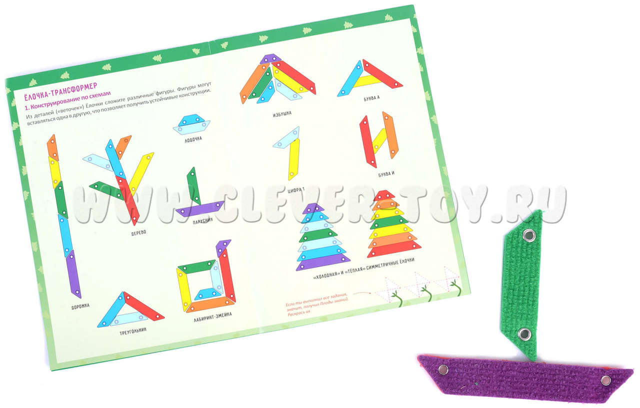- задания и упражнения с вариантами усложнения для детей разного возраста («Собери Ёлочку», «Исправь ошибку», «Укрась Ёлочку», «Развесь гирлянды», «Продолжи ряд», «Найди ошибку»). В инструкции также содержатся цветные схемы для конструирования различных фигур «Дерево», «Лодочка», «Избушка», «Парусник», «Дорожка» и т.д.