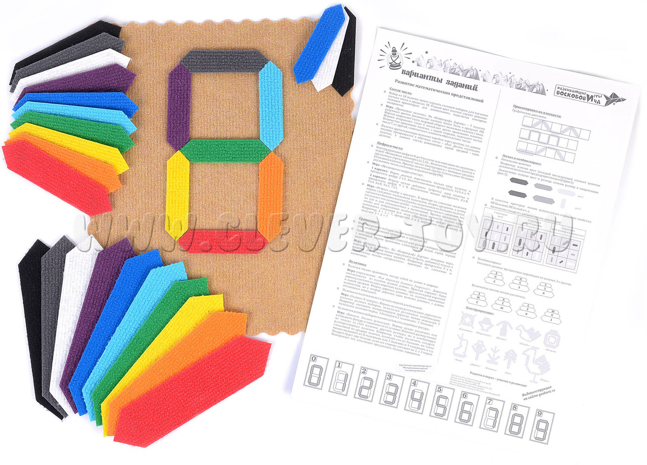 - три набора по 10 разноцветных односторонних палочек (радужные цвета + белый, серый, чёрный), палочки отличаются по величине (маленькие – 10 см., средние 14 см., большие 20 см.);