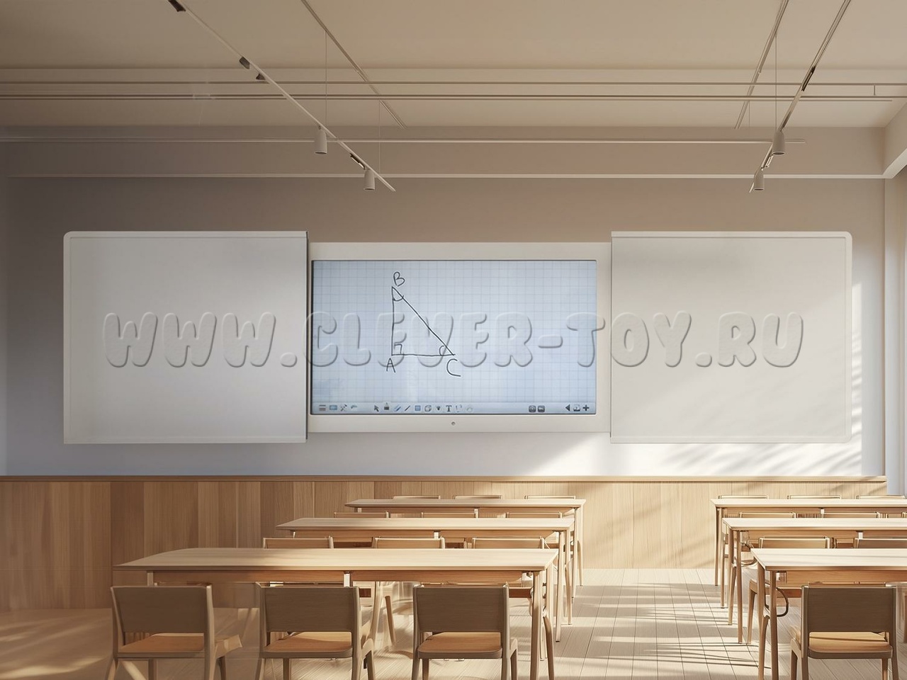 Современная школьная доска, сочетающая пишущую магнитно-маркерную поверхность и интерактивный экран со встроенным компьютером. Раздвижная конструкция доски "Фибоначчи" позволяет трансформировать рабочую зону по желанию преподавателя, и совмещать традиционные занятия от руки с инновационными инструментами в образовании. Подходит для оснащения школ, учреждений культуры, детских кружков, развивающих и коррекционных центров для детей.