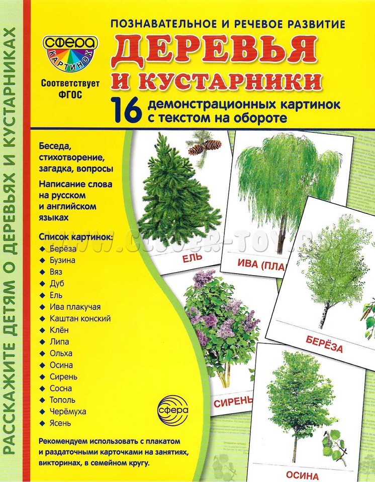 Состав комплекта (16 карточек): Берёза, Бузина, Вяз, Дуб, Ель, Ива плакучая, Каштан конский, Клён, Липа, Ольха, Осина, Сирень, Сосна, Тополь, Черёмуха, Ясень.