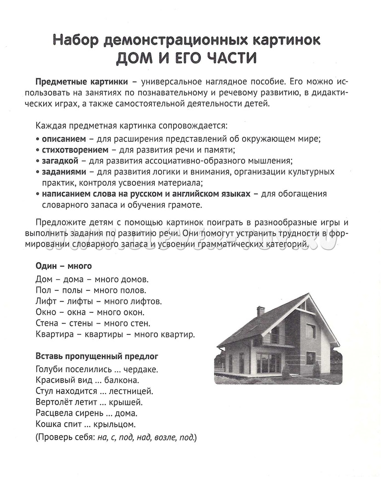 16 демонстрационных картинок для познавательного и речевого развития. На обороте каждой предметной картинки - описание дома и его частей, стихотворение, загадка, вопросы для ребёнка, название животного на русском и английском языках.
