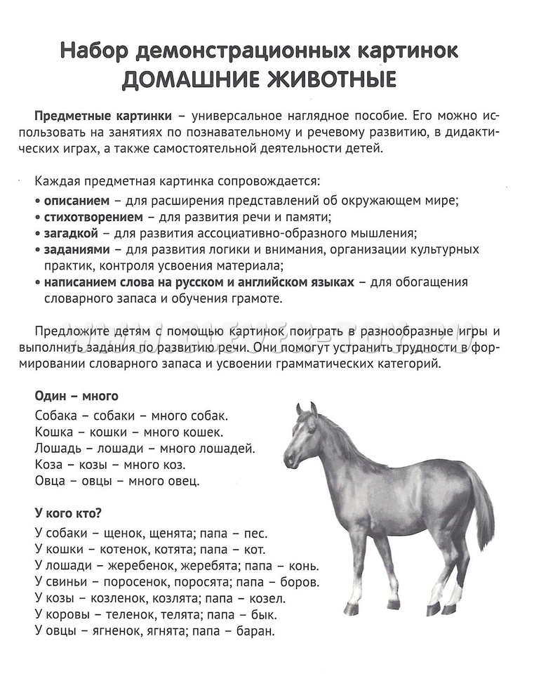 Состав комплекта (16 карточек): Баран, лошадь, жеребёнок, коза, козлёнок, осёл, корова, телёнок, кошка, котёнок, кролик, свинья, поросёнок, собака, щенок, овца с ягненком.