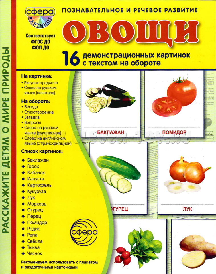 Откройте удивительный мир овощей с нашими демонстрационными карточками! Каждая карточка содержит информацию об овоще: его внешний вид, происхождение, полезные свойства и способы приготовления. Ваш ребёнок узнает много нового и интересного об овощах, полюбит их и станет здоровым и активным! Издание состоит из 16 цветных картинок с текстом на обороте. Дети не только получат ценную информацию, но и ответят на вопросы, отгадают загадки и прочитают стихотворения.