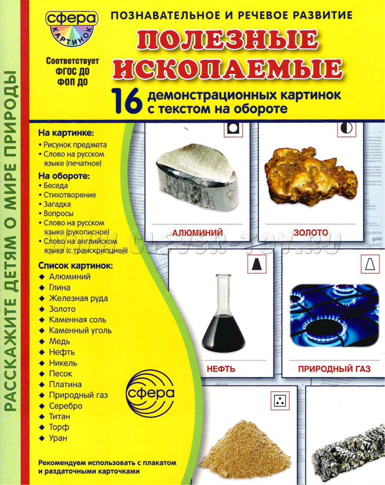 Комплект "Полезные ископаемые" состоит из 16 цветных демонстрационных карточек (картинок) и адресован детям и их родителям, желающим познакомиться с полезными ископаемыми, добываемыми на территории нашей страны.