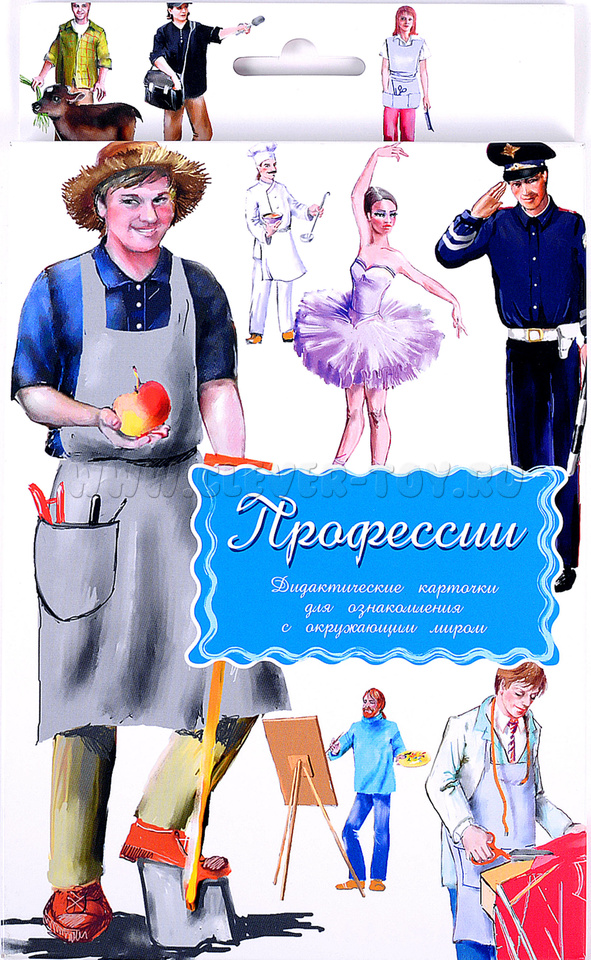 На карточках представлены: балерина, врач, портной, менеджер, инспектор дпс, парикмахер, повар, пожарный, продавец, журналист, садовод, строитель, водитель такси, учитель, фермер, художник.