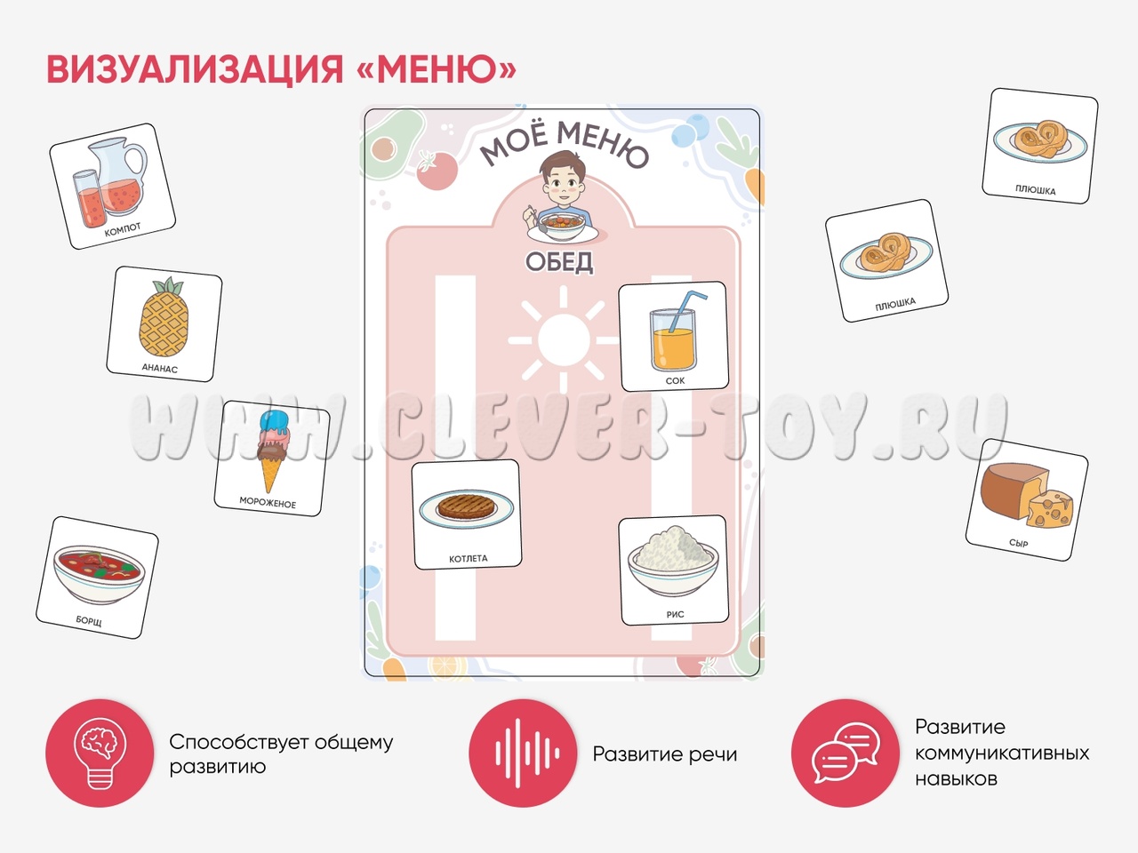 Карточки изготовлены из гладкого пластика полилит, который подходит для принтерной печати. Рисунки не стираются, карточки можно мыть и дезинфицировать, что особенно полезно при работе с детьми с повышенными потребностями. Продукция отвечает требованиям ФГОС ДО, СанПиНа и критериям программы «Доступная среда».