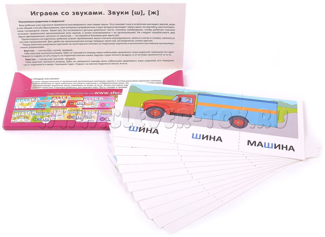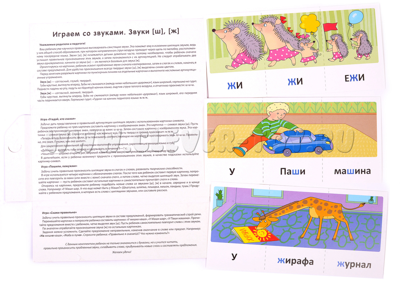 В комплекте 12 обучающих карточек, разделённых на 36 карточек и 3 игры. Ребёнок в игровой форме познакомится с шипящими звуками [ш] и [ж], научится их правильно произносить, сделает гимнастику для языка и выполнит артикуляционные упражнения.