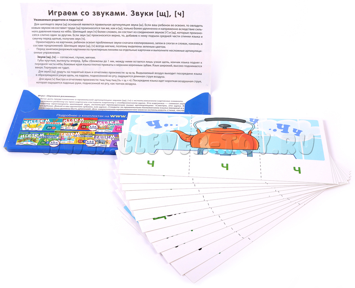 Комплект состоит из 12 обучающих картинок, 36 карточек и 3 игр. Он является продолжением комплекта "Играем со звуками. Звуки [ш], [ж]", выпущенного издательством "ТЦ Сфера";.