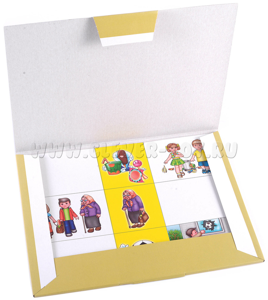 В комплект игры входят: 6 больших карт; 4 разрезные карты, состоящие из 18 карточек-картинок и 21 фишка «Хорошо» и «Плохо».