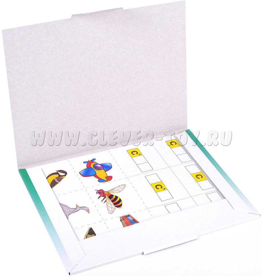 В состав набора входят 8 листов формата А4 и папка для хранения материалов. На каждом листе по 6 разрезных карточек (всего 48) и по 6 схем слов на каждый из "проблемных" согласных звуков. Перед началом игры родителю или педагогу необходимо разрезать карты по пунктирным линиям (получится 48 карточек с картинками и 8 карт со схемами слов).