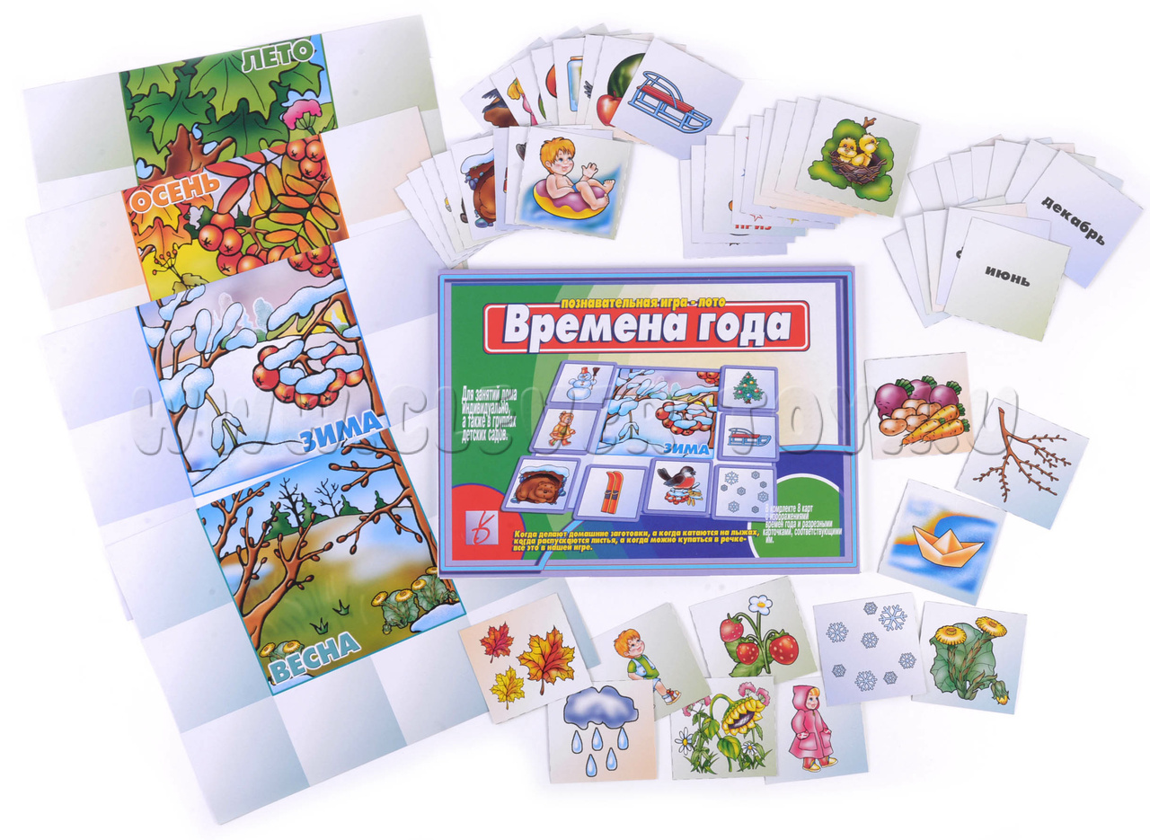 Познавательная игра-лото "Времена года" познакомит малышей с характерными особенностями каждого из 4-х времен года, месяцами и их названиями. Занятия с игрой в увлекательной легкой форме помогут ребенку в развитии: