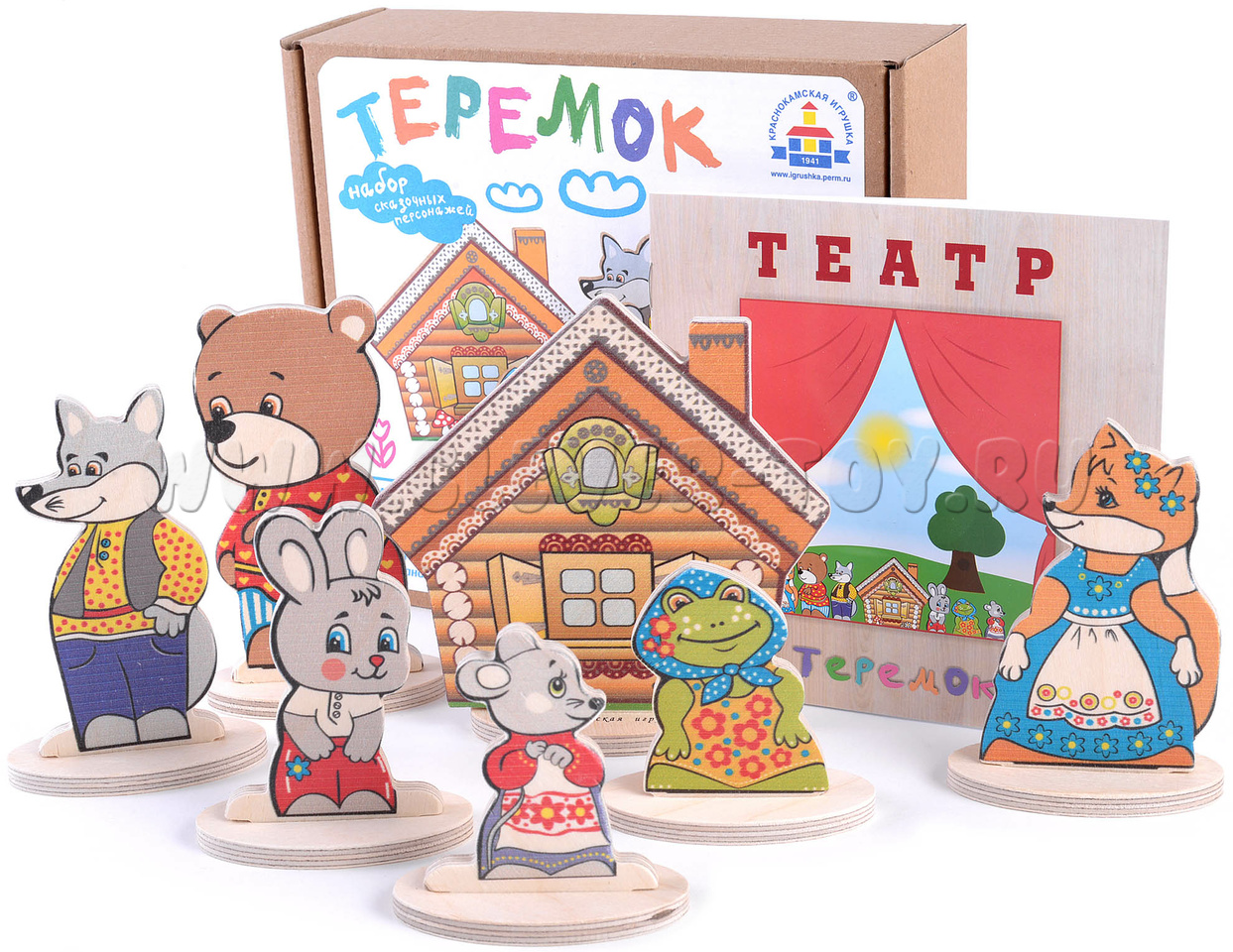 - 7 сказочных персонажей на подставках(заяц, мышка,лягушка, медведь, волк, лиса, теремок) от 6,5 до 12 см.;
