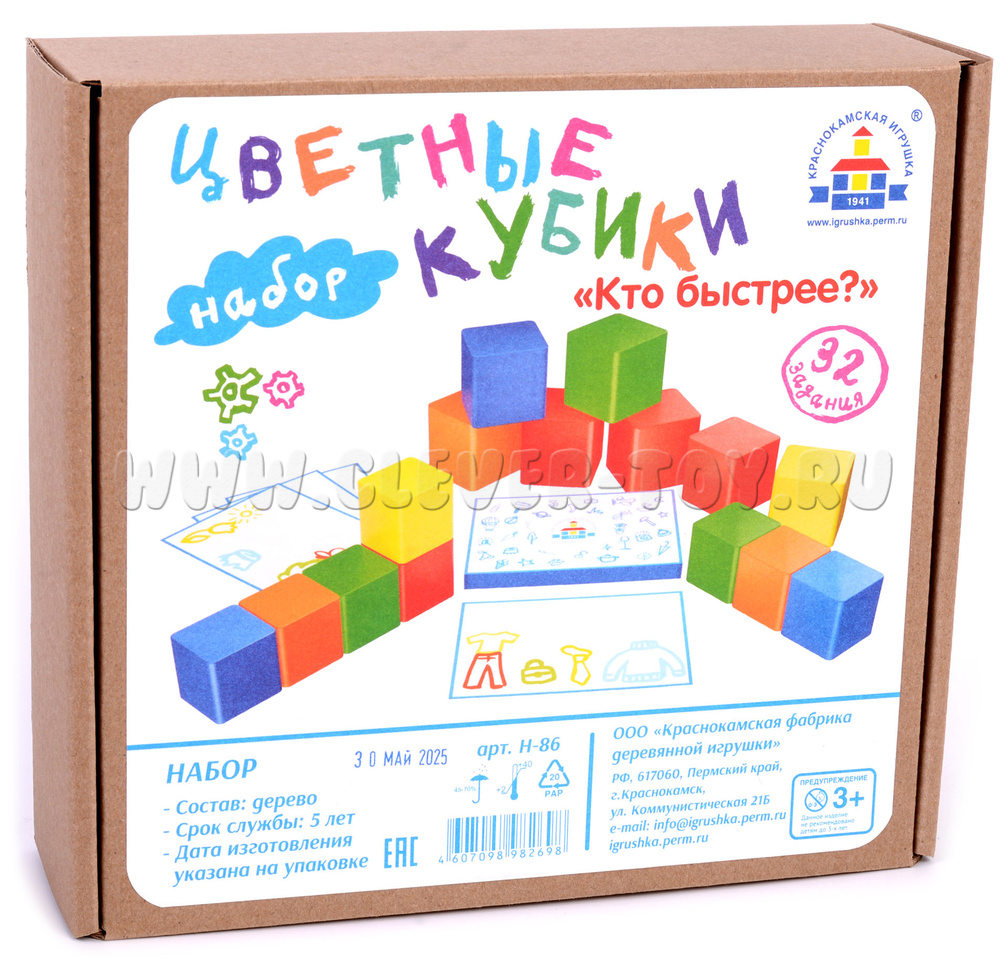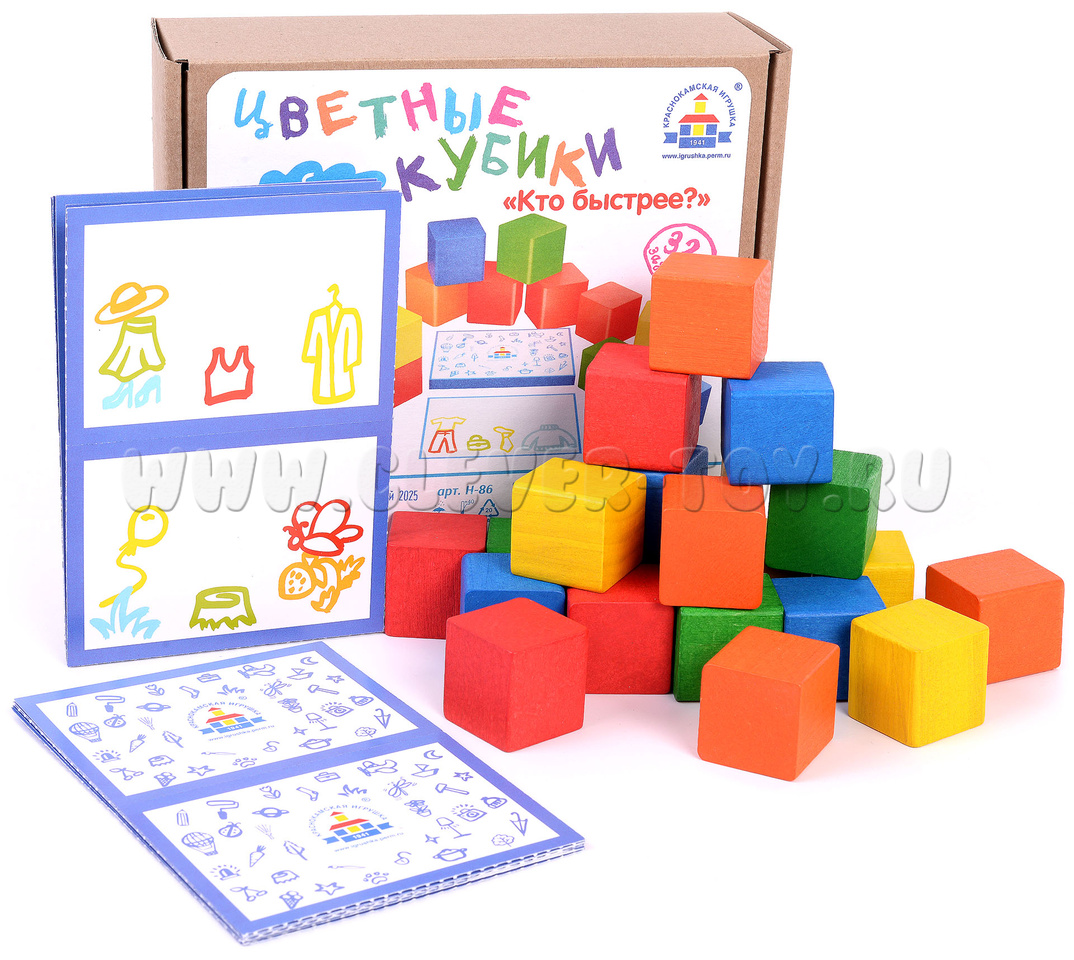 Правила. Игроки расставляют кубики по соответствующим цветам элементов на карточке с заданием. Кто первым это сделает - забирает картинку. Победителем окажется обладатель наибольшего количества карточек.
