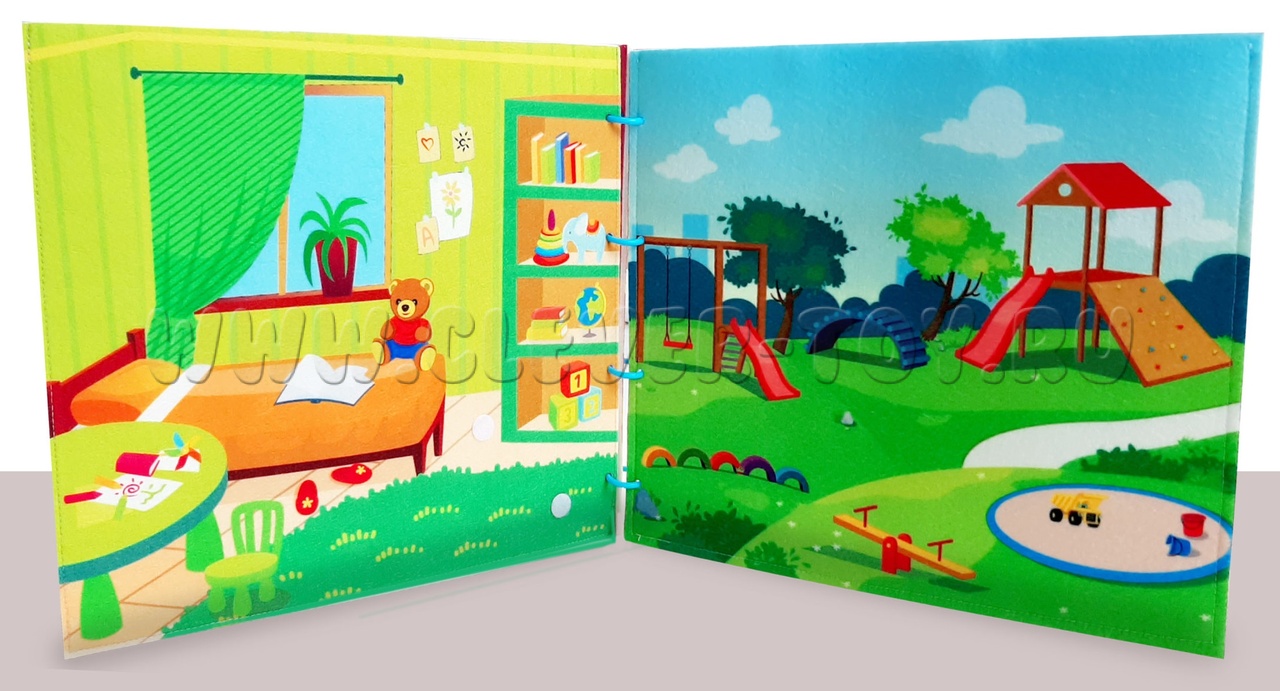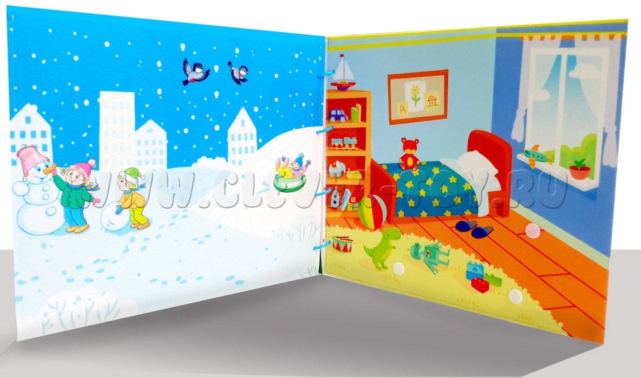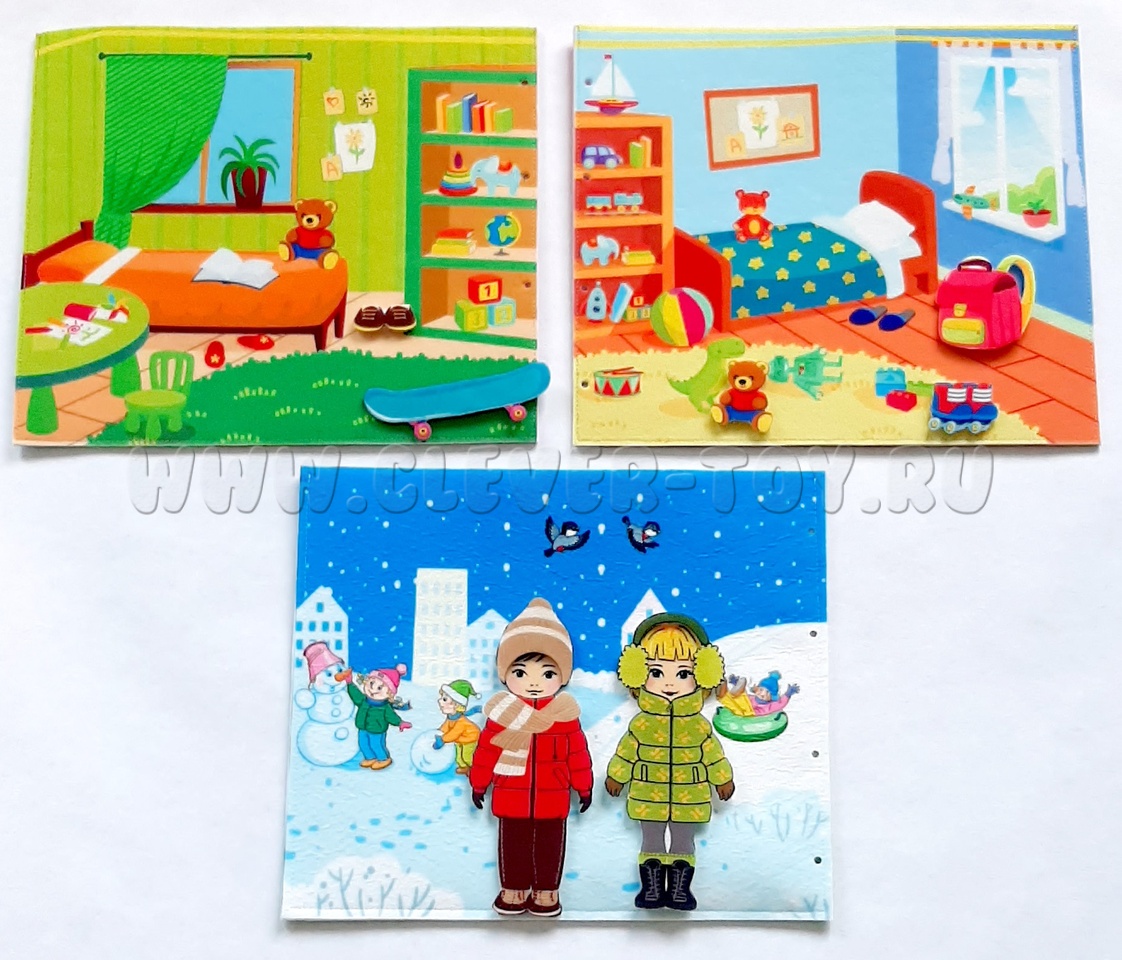 Папка "Одевай-ка" - это многофункциональная игровая книга, состоящая из четырёх страниц с изображениями двух детских комнат и площадки для прогулок в разные времена года.
