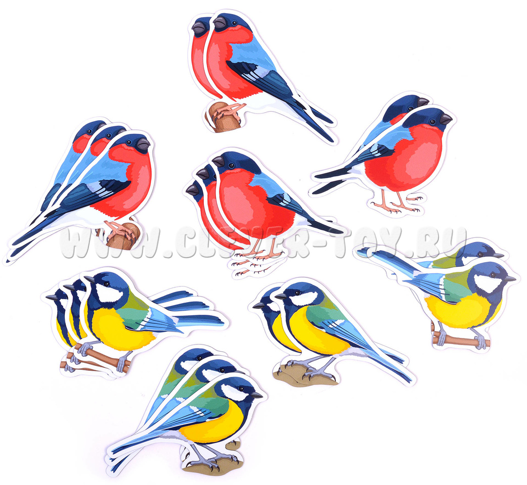 Кстати в наборе 10 снегирей и 10 синиц. Размер карточек варьируется от 6 до 7 см в высоту, а их ширина, как правило, 10 см.