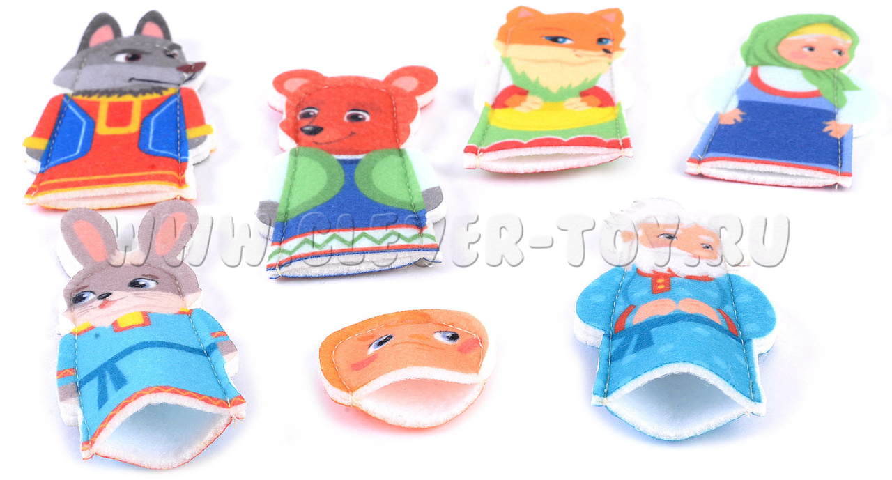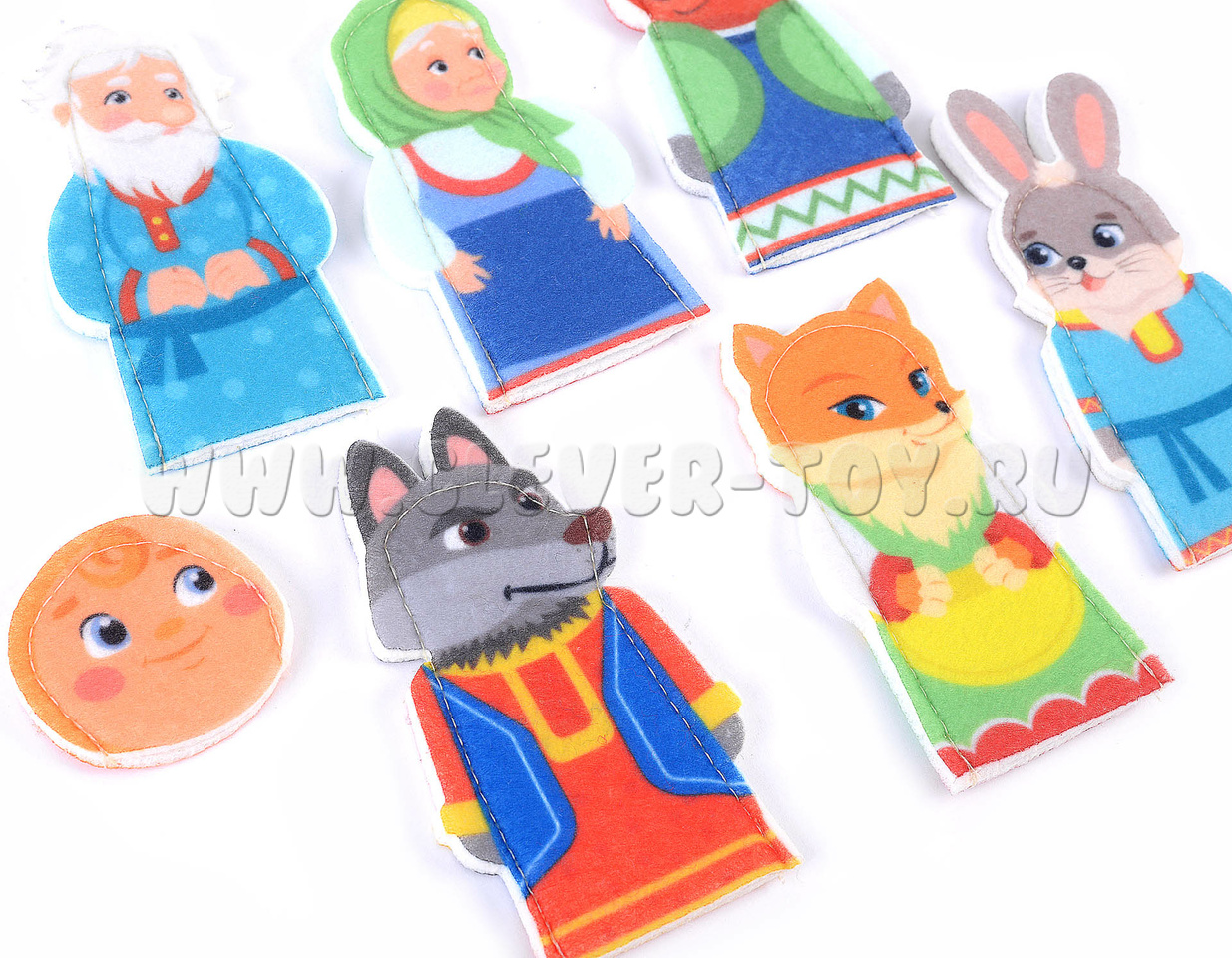 Набор пальчикового театра состоит из: 7 фигурок (размер: 9 см) с изображением сказочных персонажей сказки Колобок (Старик со старухой, Колобок, Заяц, Волк, Лиса ) и инструкция с описанием игр.