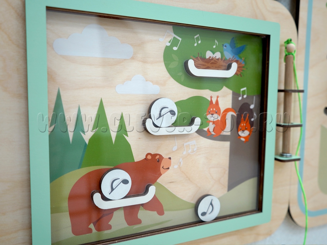 Модуль "Музыкальные регистры" с магнитной указкой-манипулятором и подвижными нотками знакомит детей с тремя вариантами звуков: высокий регистр - птички, средний - белочки, низкий - медведь. После прослушивания звукоряда, аккорда или мелодии дети выбирают подходящий регистр и перемещают нотку на нужную позицию.
